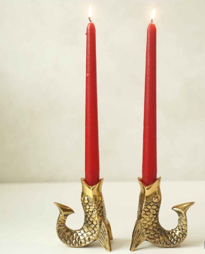 Illuminate your space with our whimsical fish tail candle holders. This stunning brass pair features intricate scale details, adding a unique, nautical elegance and a sophisticated glow to your décor.